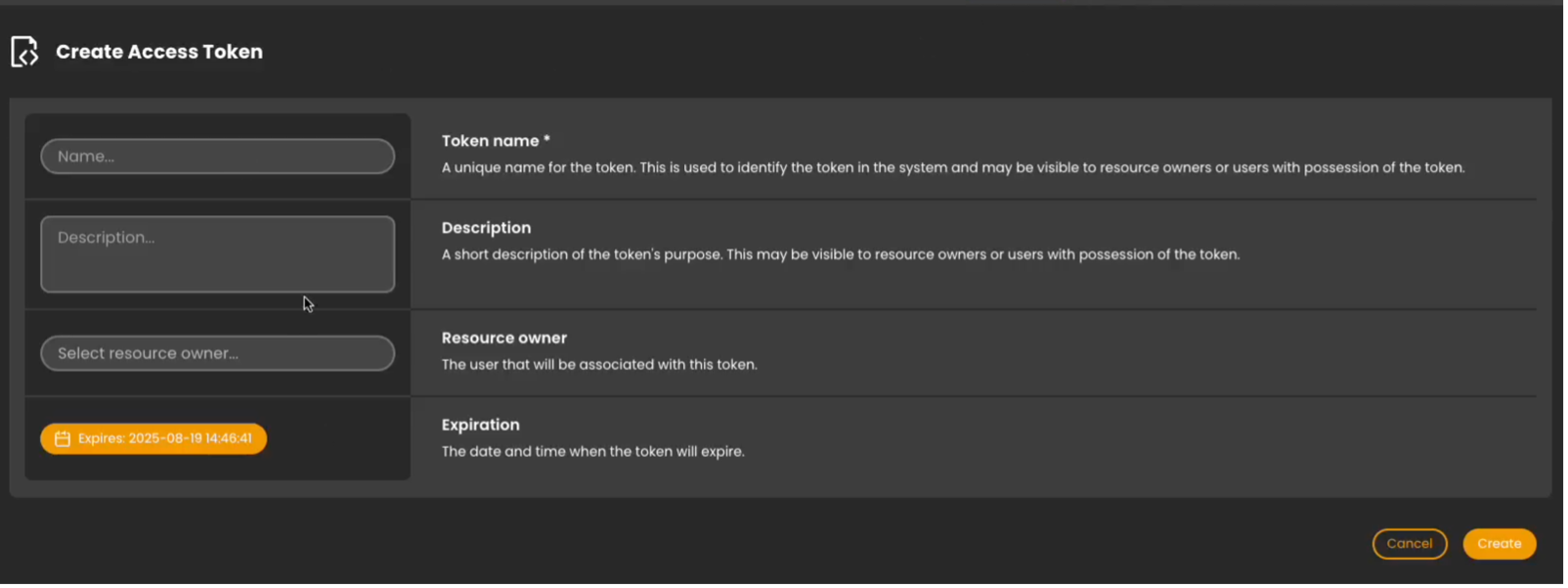 - The user will be navigated to the ‘Create Access Token’ screen and presented with a form.