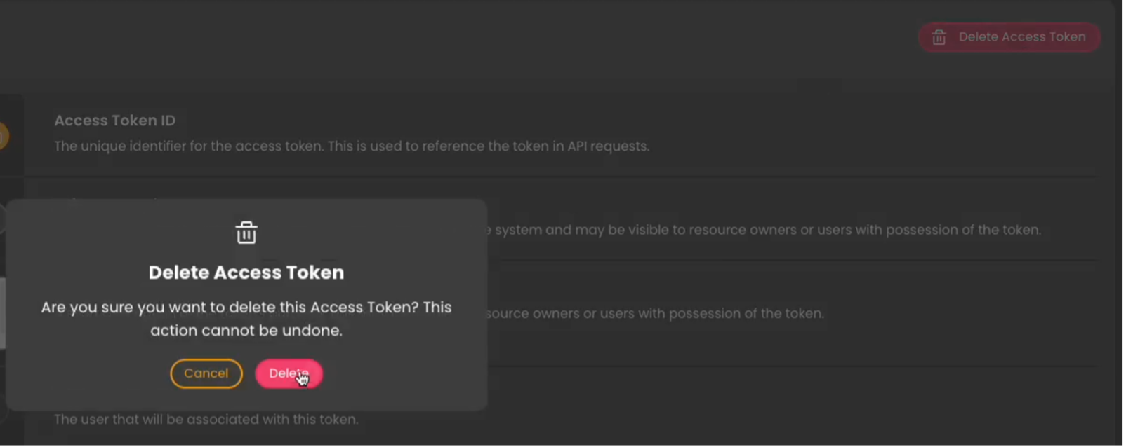 - On the ‘edit access token’ screen, click the ‘Delete Access Token’ button at the top of the form.
